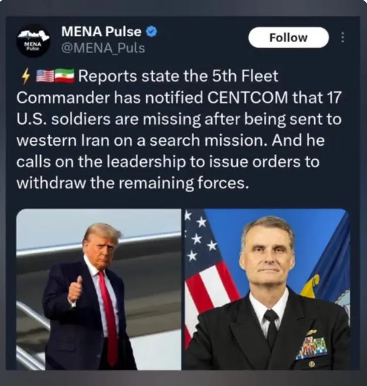 BREAKING NEWS The commander of the US Fifth Fleet has informed the Senate Committee that 17 US soldiers have gone missing during a search mission in Iran.