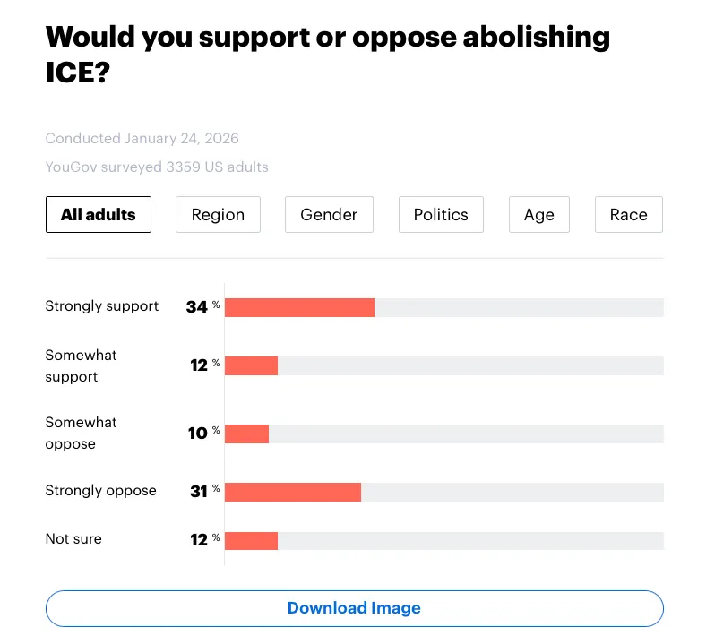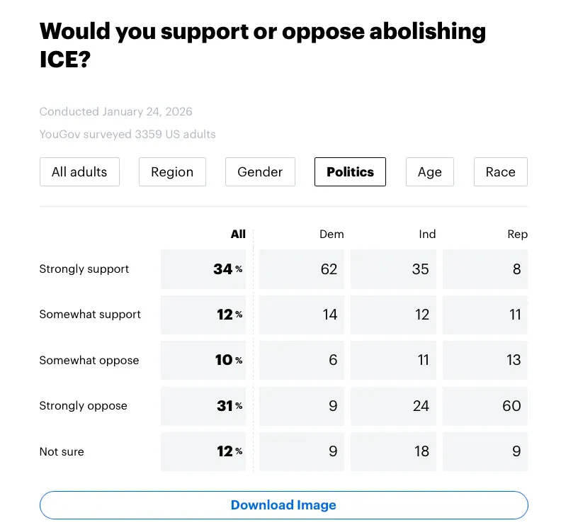 YouGov is out with a new poll after ICE killed another person in Minnesota today. Abolishing ICE is now +5 among all adults, and **+12 among independents**