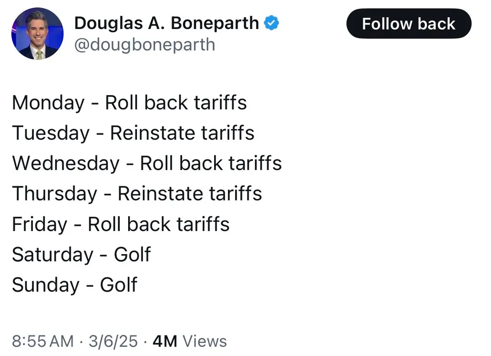 Monday - Send more troops Tuesday - Say we’re ending war Wednesday - Send more troops Thursday - Say ending war Friday - Send more troops Saturday - Golf Sunday - Golf