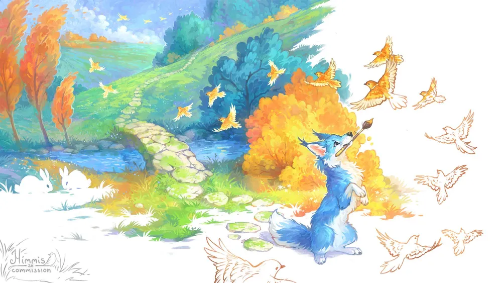 "Hello World" - experimental Illustration for Folleach, with their bonk painting a world of his dreams. Knowing him, it'll have free wi-fi for everyone, and maybe some rivers and smaller streams to toy around with the boats in ^v^
