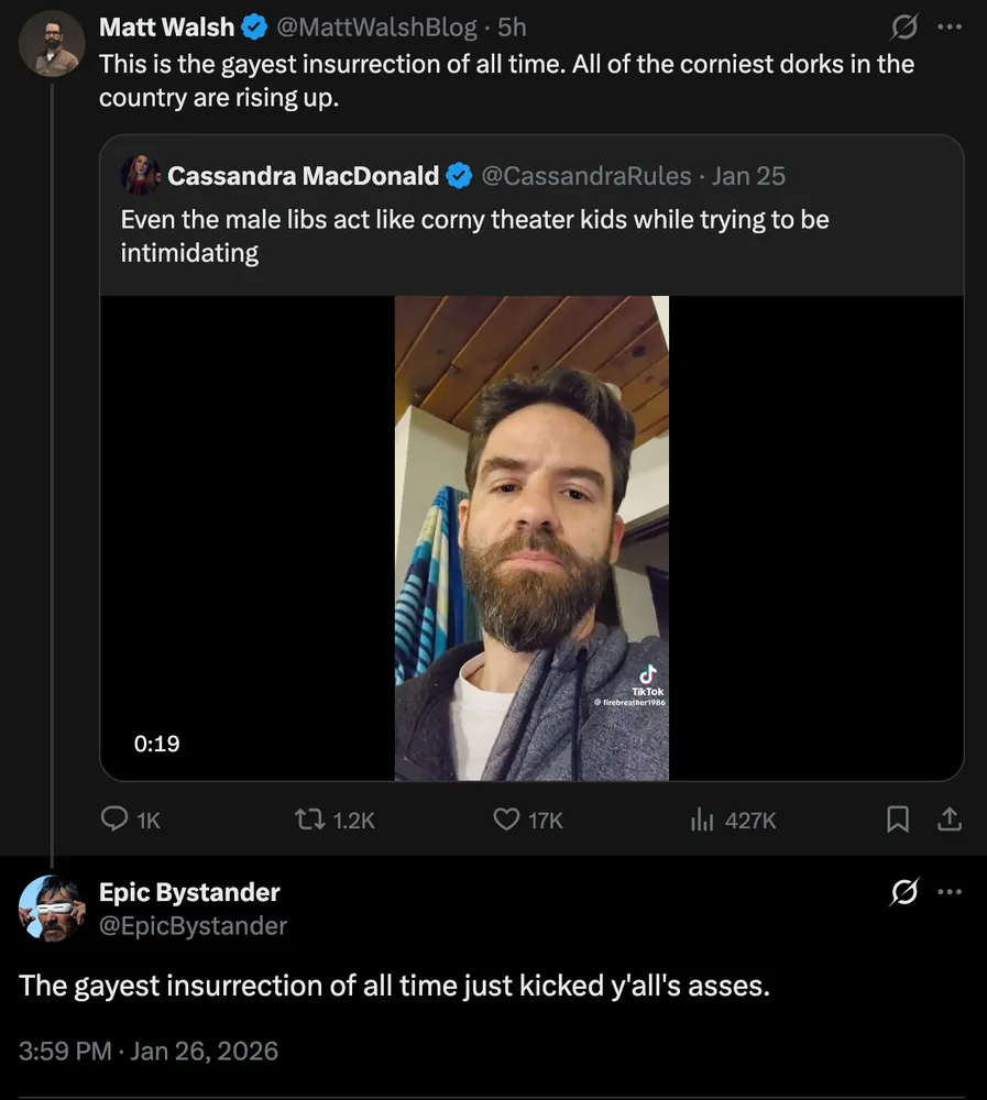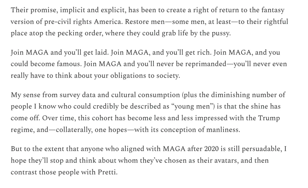 Alex Pretti’s most immediate legacy is galvanizing the country against tyranny. We should do what we can to see to it that his other legacy is reclaiming the public meaning of masculinity from the whiny, sadistic freaks responsible for his murder. www.offmessage.net/p/alex-pretti-maga-and-the-public-meaning
