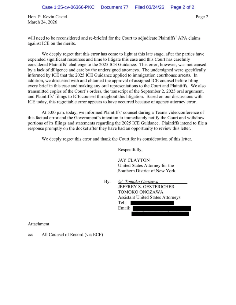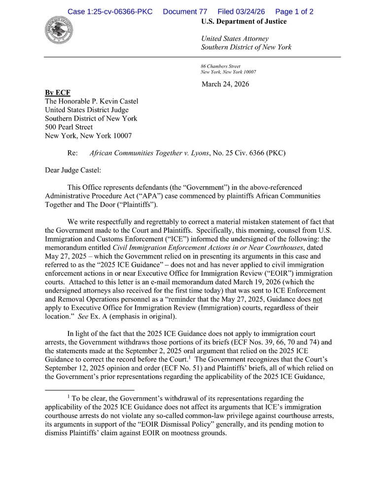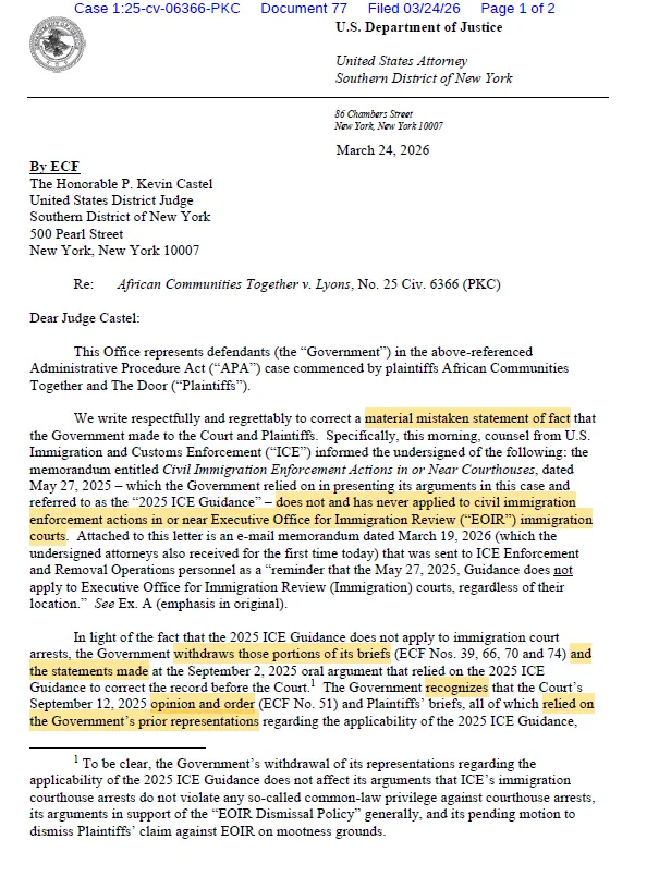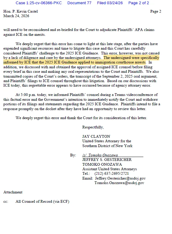 DOJ admits to having repeatedly made "material mistaken" representations to judge - ICE never had authority (under 2025 Guidance) to conduct arrests at immigration courthouses!