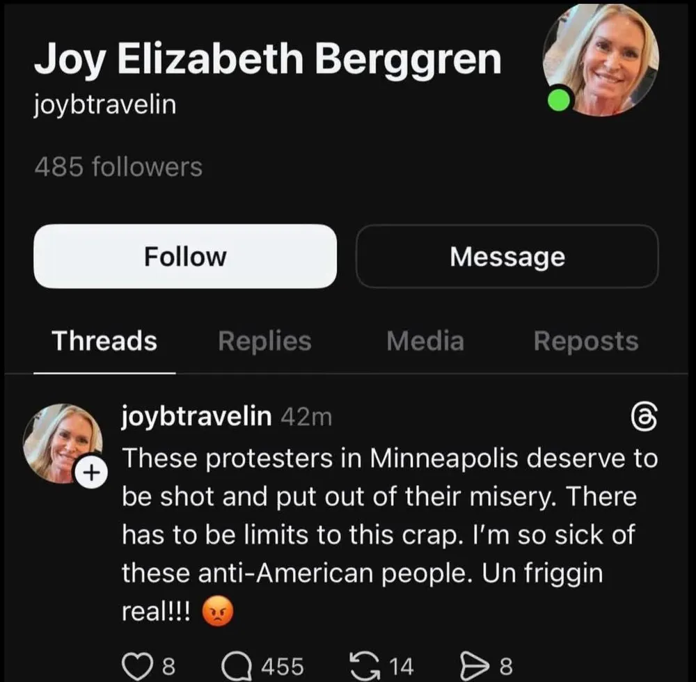 Joy Berggren used social media to call Minneapolis protestors un-American, said their speech should be limited, and called for them to be shot.