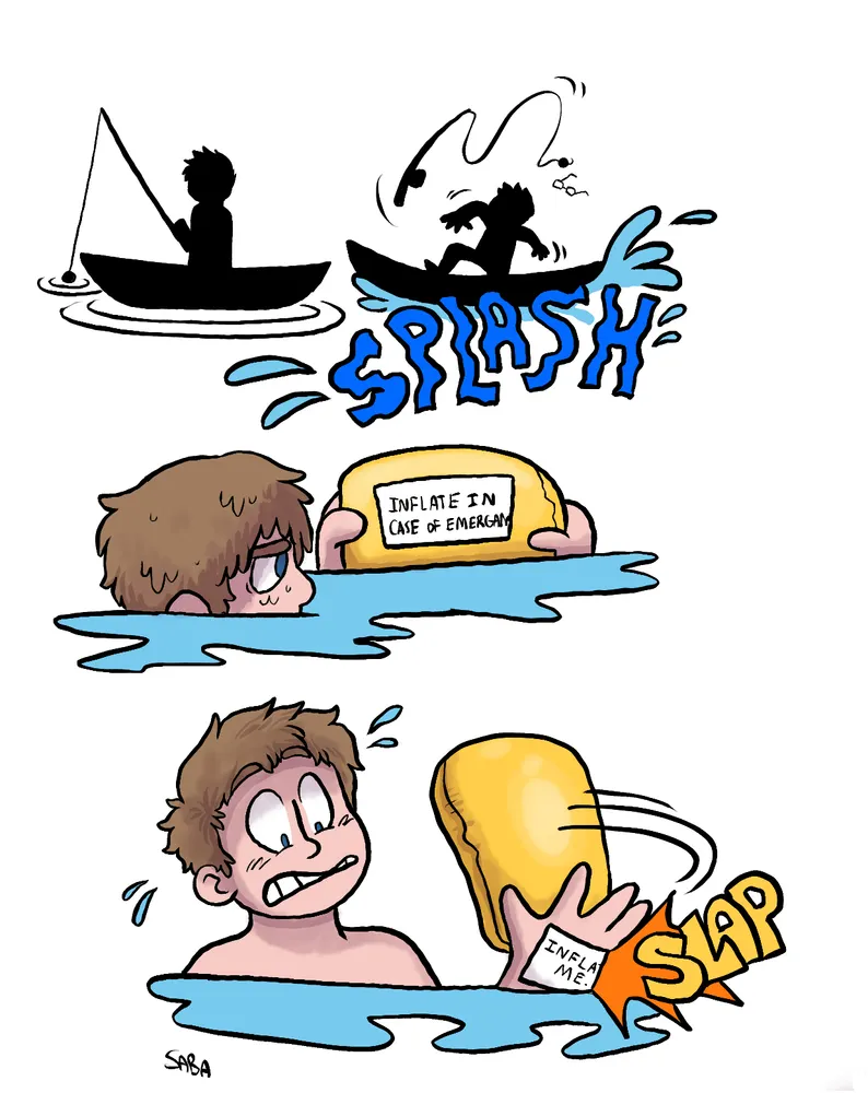 Accidentally fell off my boat into the water. Good thing I have this emergency flotation device. Wait I donโt think itโs suppose to inflate me! Ahh well, at least I can now vibe and float in the water!