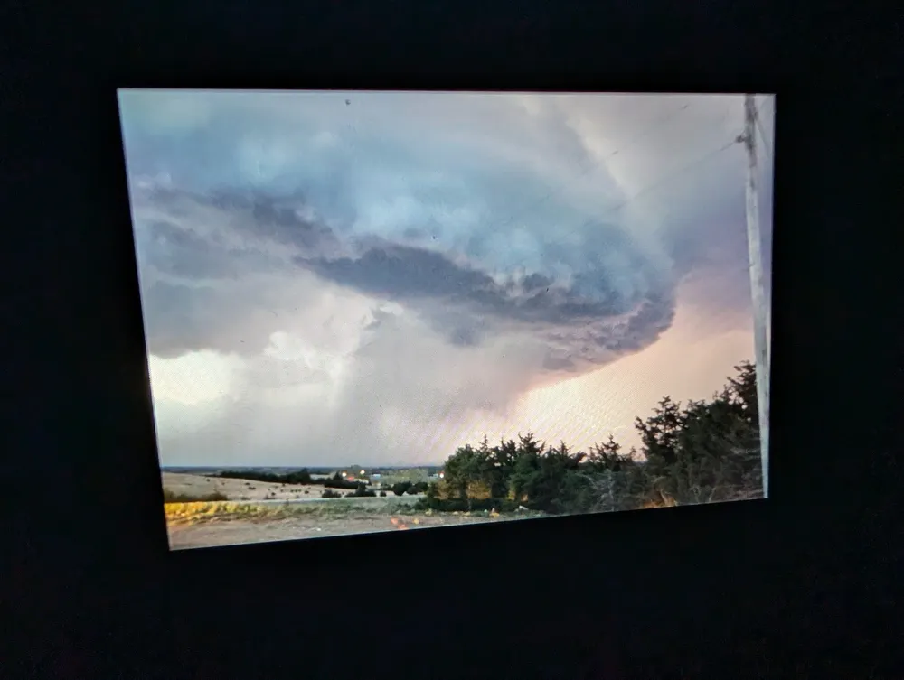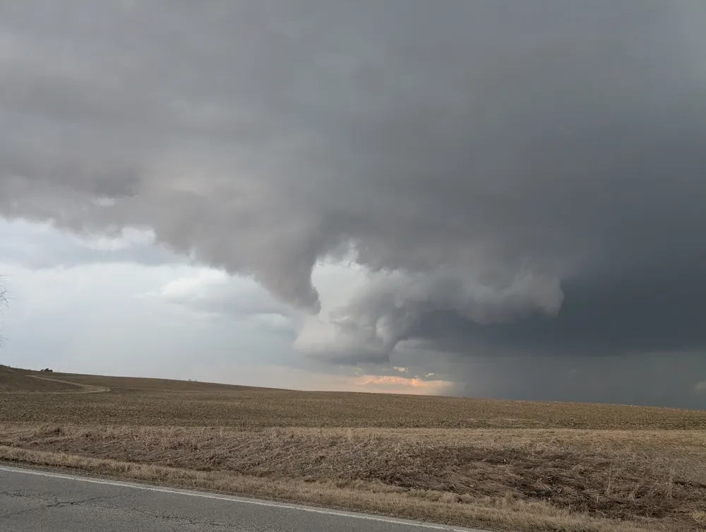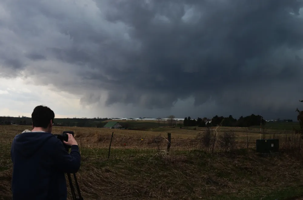 Me setting up for video of a supercell thunderstorm south-southwest of Kalona, IA at 150th St. & Larch Ave. around 4 PM last Thursday, 4/2/2026. Then a funnel/per other chasers who were closer/ brief tornado seen from south of West Liberty around 40 minutes later. Photos by my chase partner Luke.