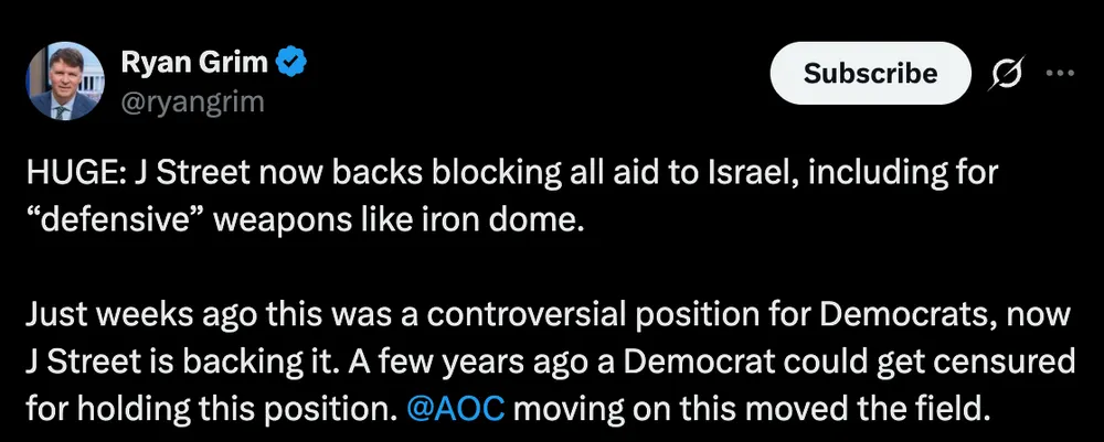Just weeks ago this was a controversial position for Dems, now J Street is backing it. A few years ago a Dem could get censured for holding this position. @aoc.bsky.social moving on this moved...