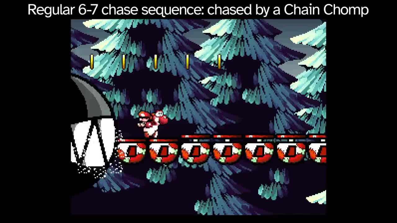 In World 6-7 of Yoshi's Island, Yoshi is chased by giant Chain Chomps. The level is intended to be linear, so backtracking from the checkpoint may cause the Chain Chomps to become glitched. Now, Yoshi will be chased by a singular floating eye, which will cry at the end.