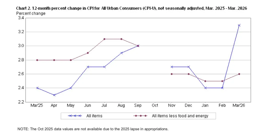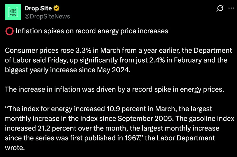 Consumer prices rose 3.3% in March from a year earlier, the Dep't of Labor said Fri., up significantly from just 2.4% in Feb. & the biggest yearly increase since May 2024.
