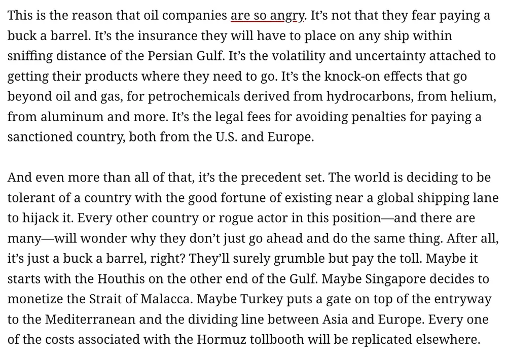 - there's still a war - the only country engaged in a ceasefire is the united states - the strait of hormuz is apparently going to a subscription model - there are precisely zero points of actual agreement