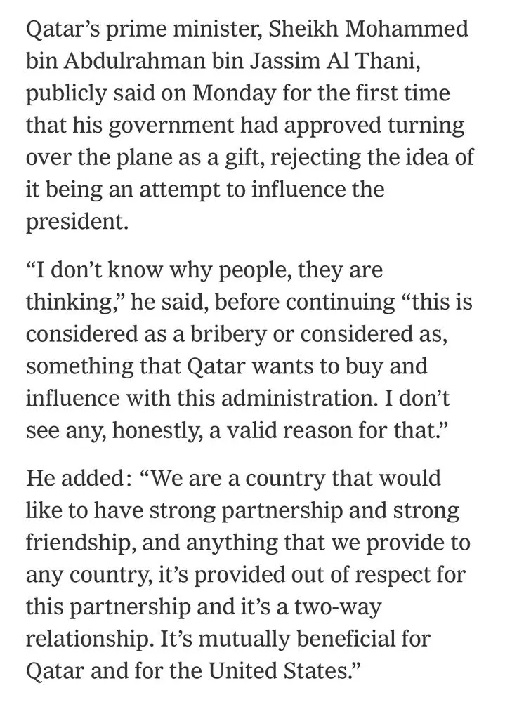 The government of Qatar is telling the NYT that giving Trump a plane benefits them. Don't we have a right to know how?