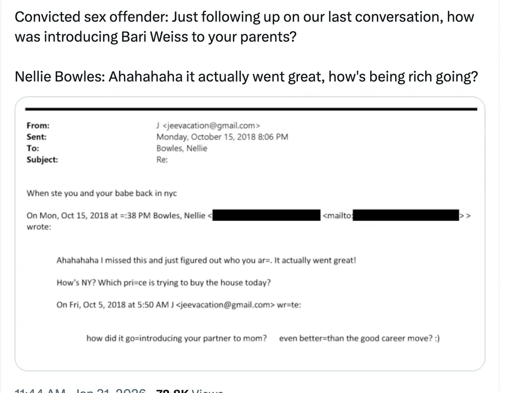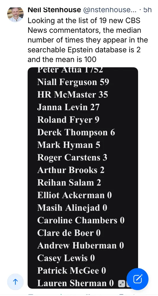 1. The new batch of Epstein documents helps illuminate one contemporary controversy: What is Bari Weiss up to at CBS? I think the answer is she is trying to rehabilate the Epstein network as a bulwark of reactionary centrism. Let me explain.