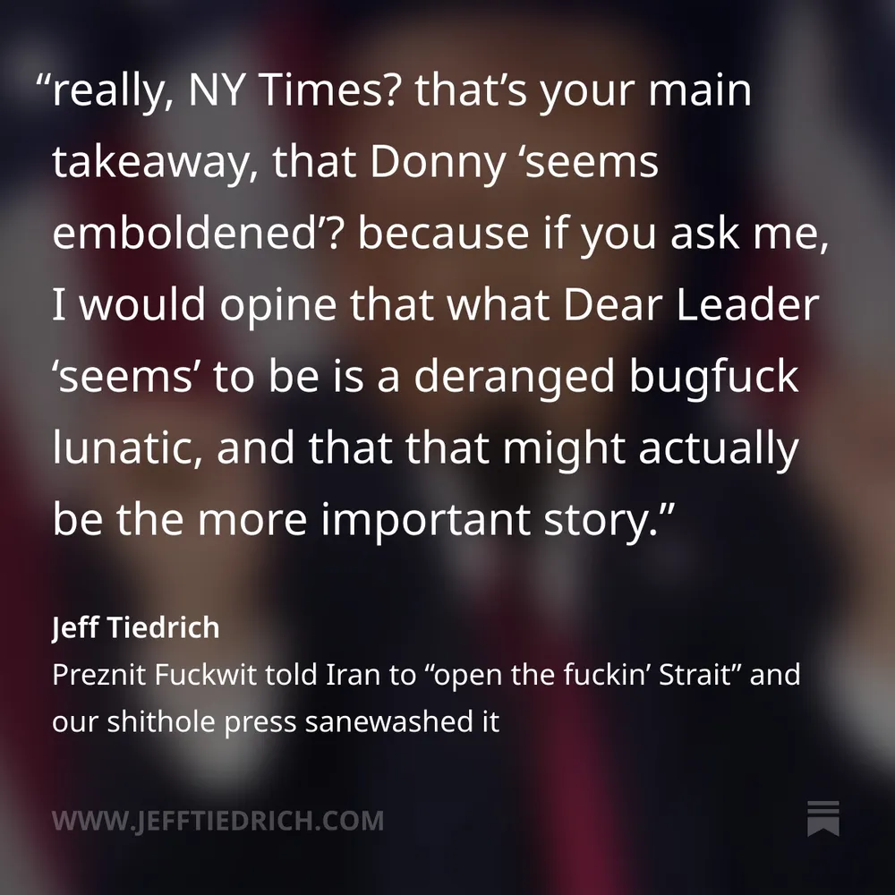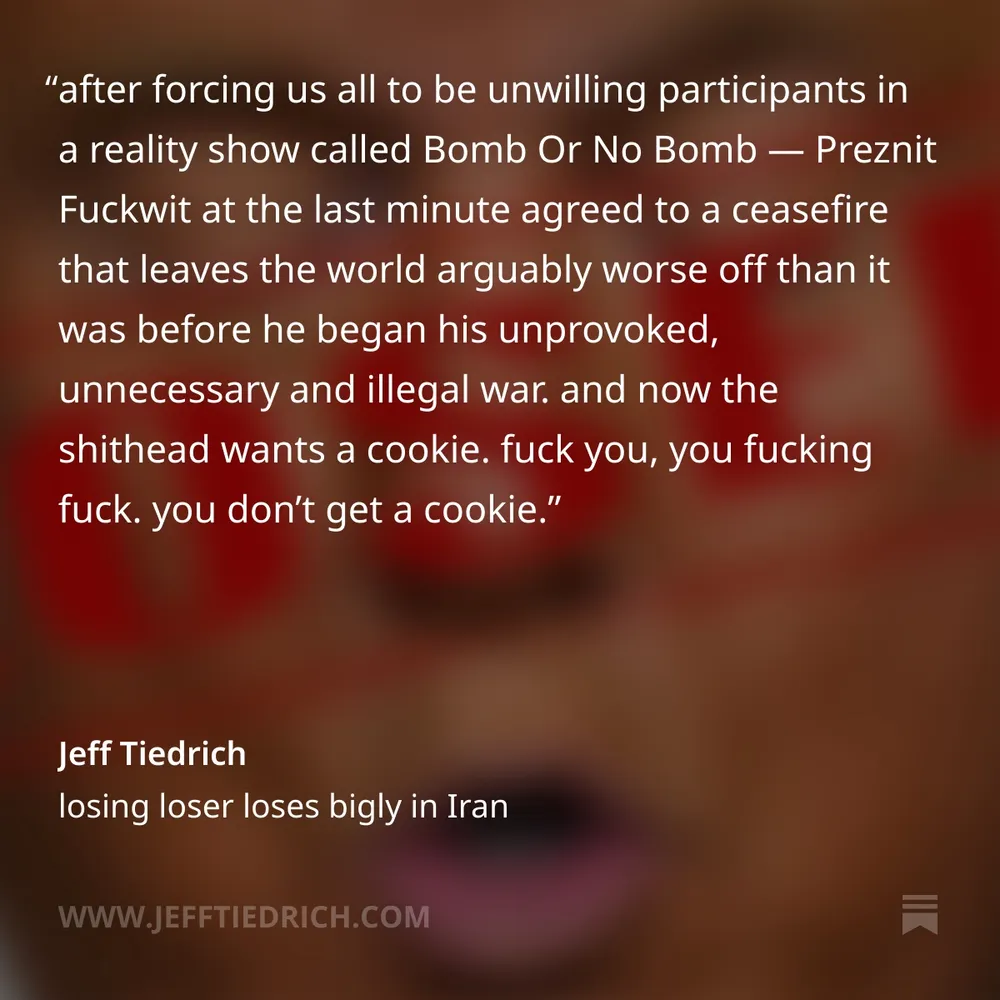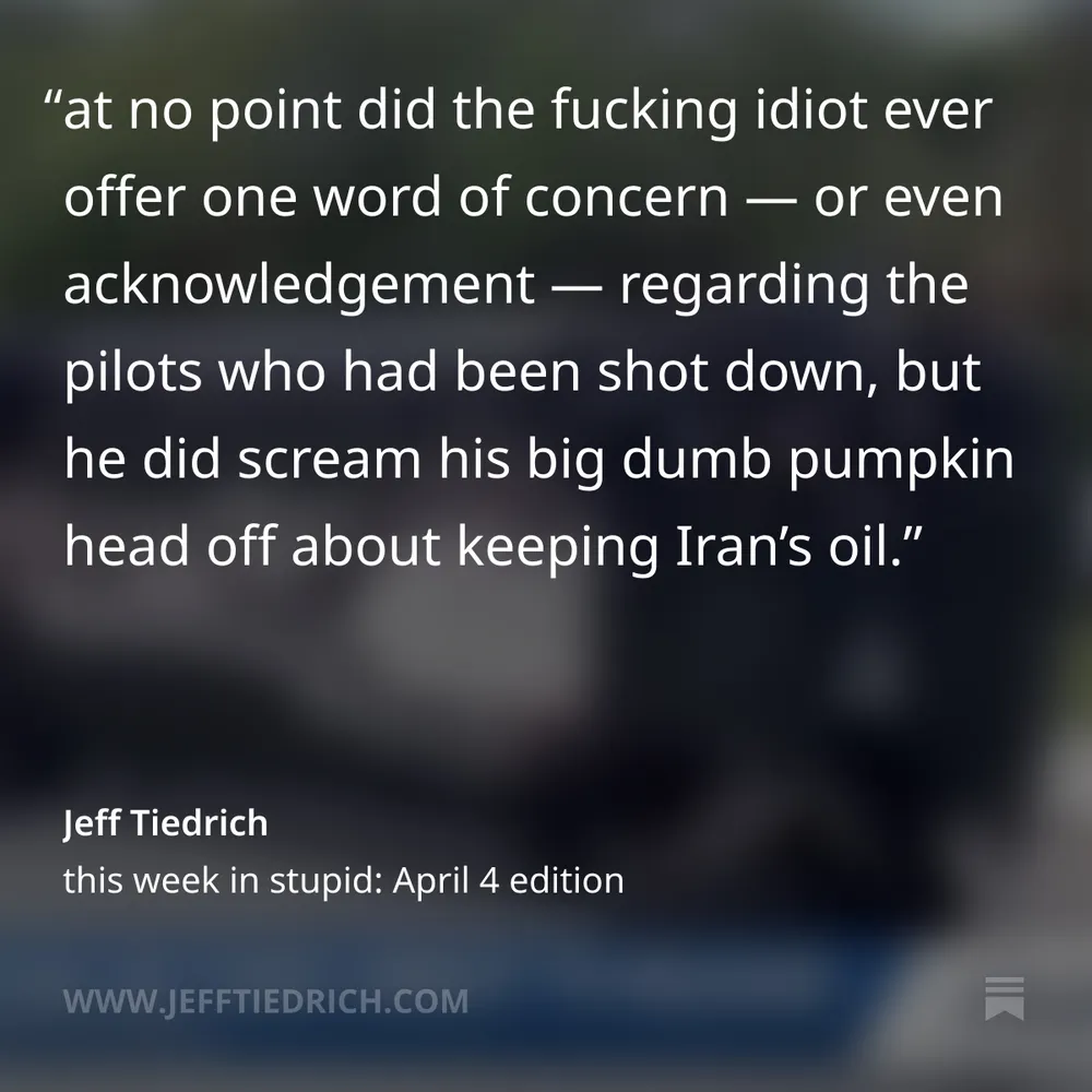 royal ass-kisser Jesse Watters claims Iran *respects* Dear Leader. oh please, Tehran knows Donny is a buffoon. have you seen their mocking videos? I cover that and all the other dumbfuckery that happened in "this week in stupid," thank you for your attention. link is here: bit.ly/4tAMCDG