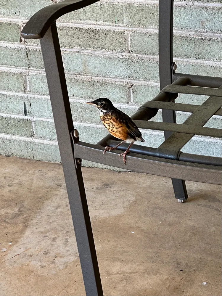 The cats and I have spent the afternoon watching the baby robin bounce around the carport as he gets up his nerve to fly. Mama is keeping an eye on him too. What a cutie he is. #birdsky