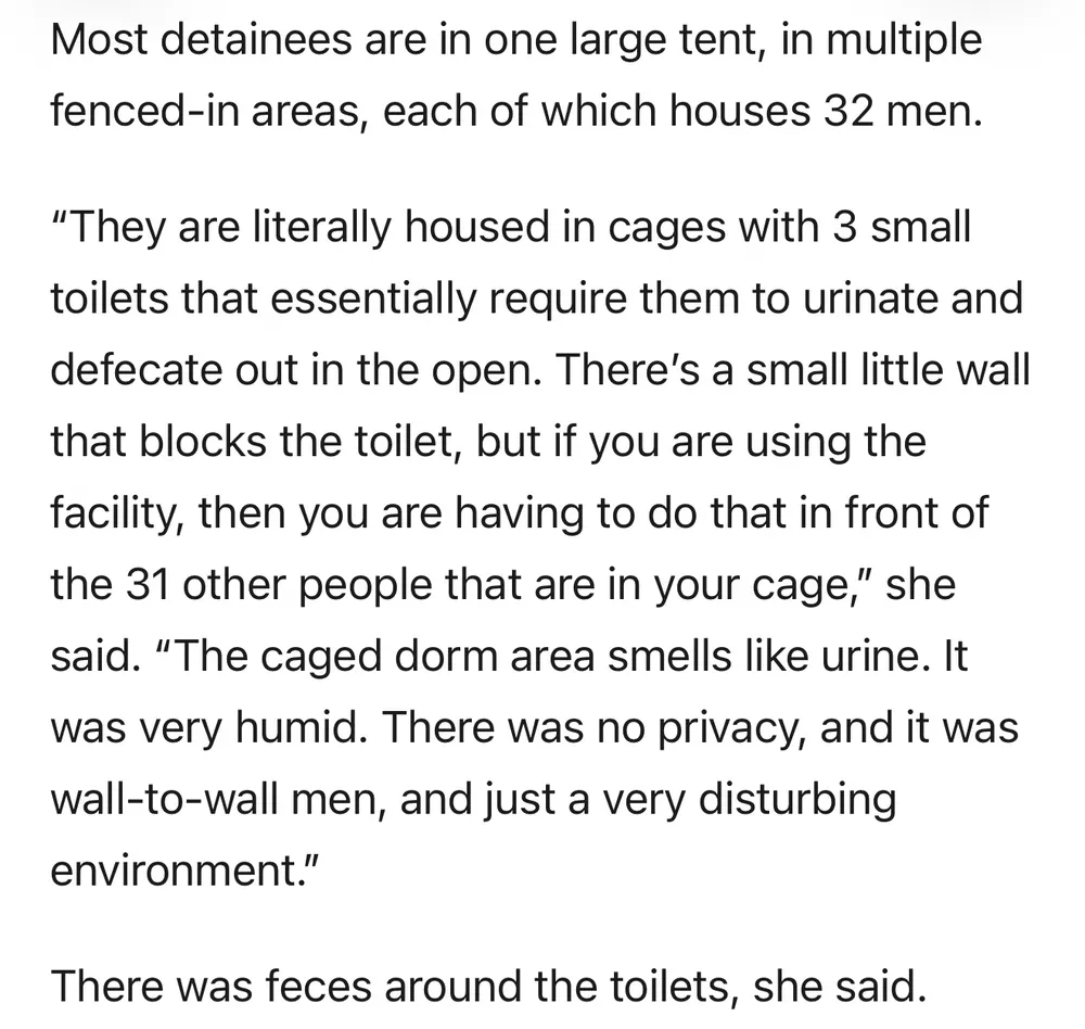 After three hours inside the confines of the immigrant detention center in the Florida Everglades, Rep. Debbie Wasserman Schultz said she discovered needlessly inhumane conditions, including 32 men housed in each cage, minimal food and a persistent odor of urine.