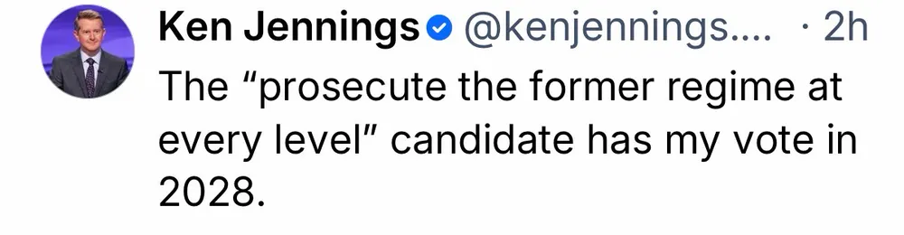 The “prosecute the former regime at every level” candidate has my vote in 2028.