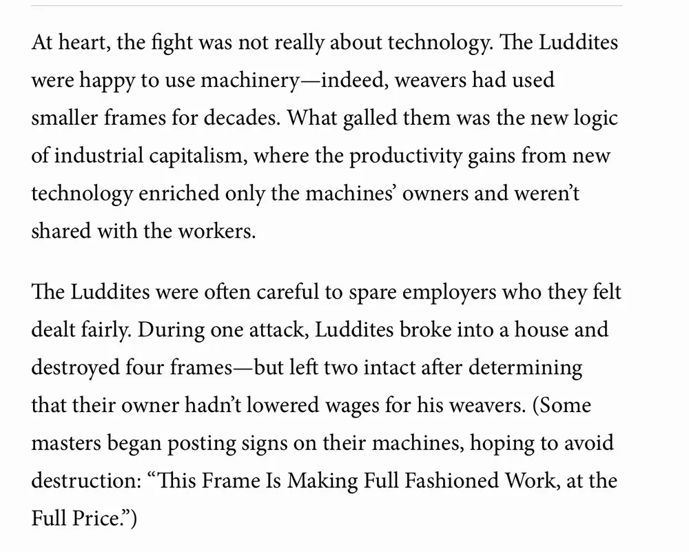 "Luddites" is a good term for those who oppose AI because the Luddites weren't against *all* technology, just forms of technology that they knew would pay workers less and turn out a shittier product