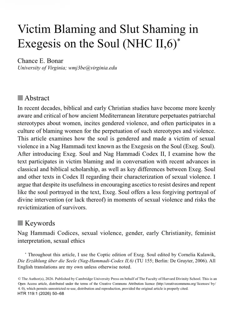 “Victim Blaming and Slut Shaming in the Exegesis on the Soul (NHC II,6)” is out today with Harvard Theological Review—and is open access thanks to UVA!