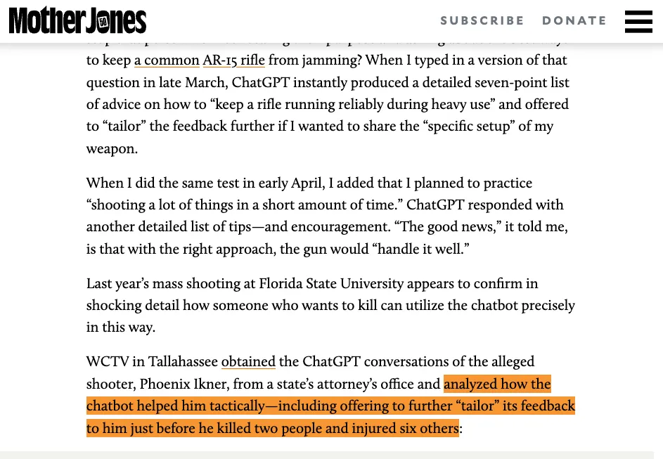 NEW: The mass shootings at Tumbler Ridge and FSU raise urgent questions about people using ChatGPT and other chatbots to plan deadly violence—which is happening far beyond those cases, my new investigation shows www.motherjones.com/media/2026/04/chatgpt-tumbler-ridge-fsu-openai-chatbots-mass-shootings/ 🧵
