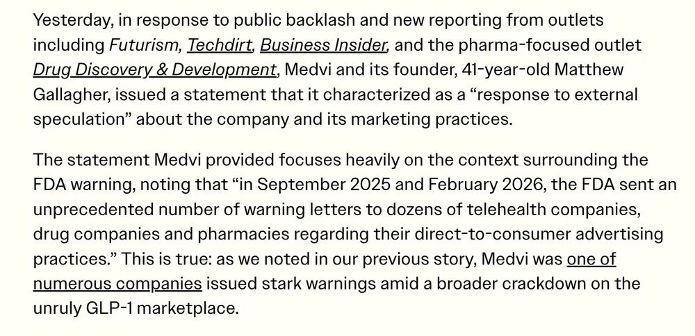 NEW: Medvi -- the compounded drug marketer featured in *that* NYT profile -- issued a statement yesterday in response to public scrutiny over dishonest marketing tactics (fake doctors, fake patients) and an FDA warning.