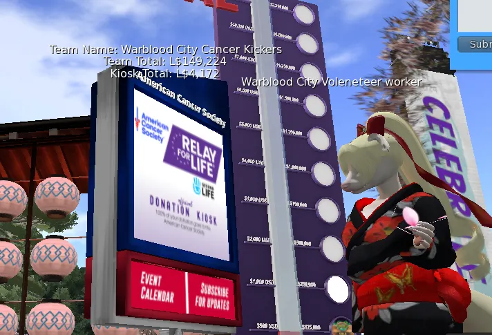 To everyone who helped donate to relay for life, on behalf of the Warblood City Cancer Kickers, we made over 50K which places us at Silver fundraising level! With the upcoming Sakura Festival;, we hope to reach the next level which is Gold (L$125,000) maps.secondlife.com/secondlife/Warblood%20Isle/106/184/21
