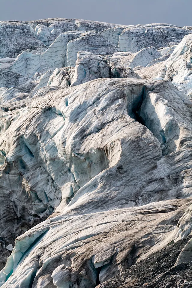 The Gabriel Icefall on the Gulkana Glacier, Eastern Alaska Range. About 400 vertical feet of ice in this frame. The striations are annual accumulation layers that become folded during flow.