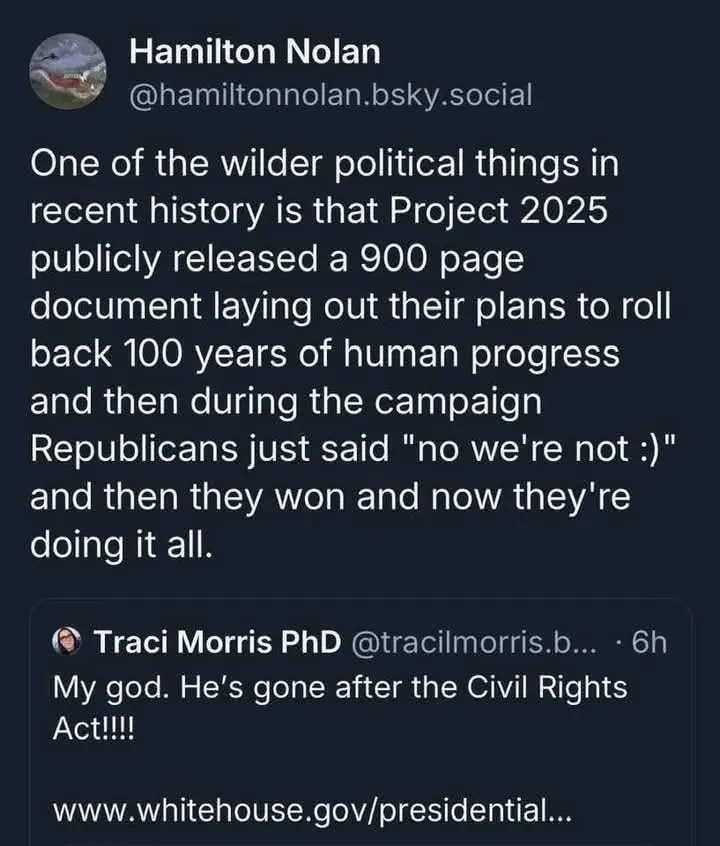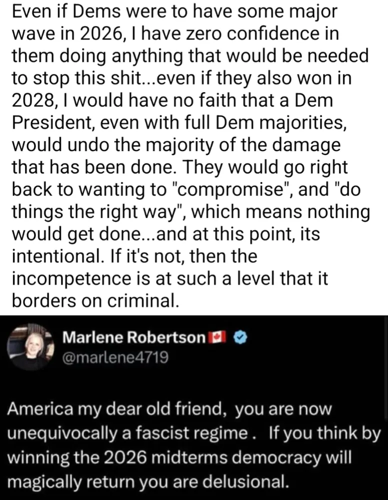 Dems never took this seriously enough to resist right off the bat, when the Regime change took over on Nov 7. So here we are, troops in city streets, illegal ICE raids w/o due process, break down of rule of law, the 3 branches of govt, our social, medical, economic safety nets.