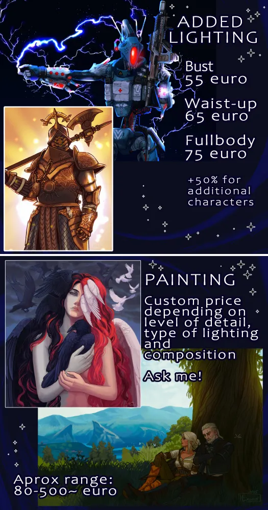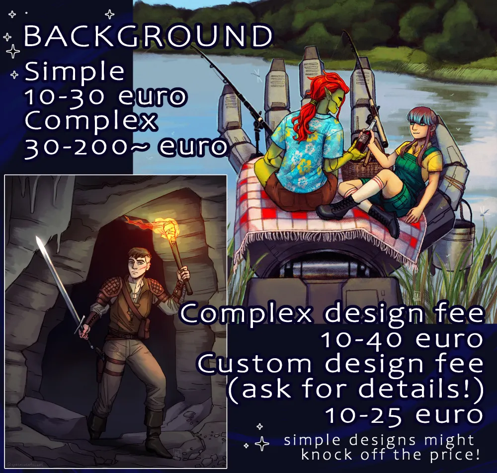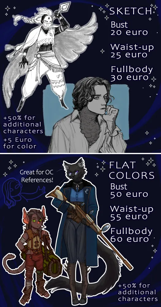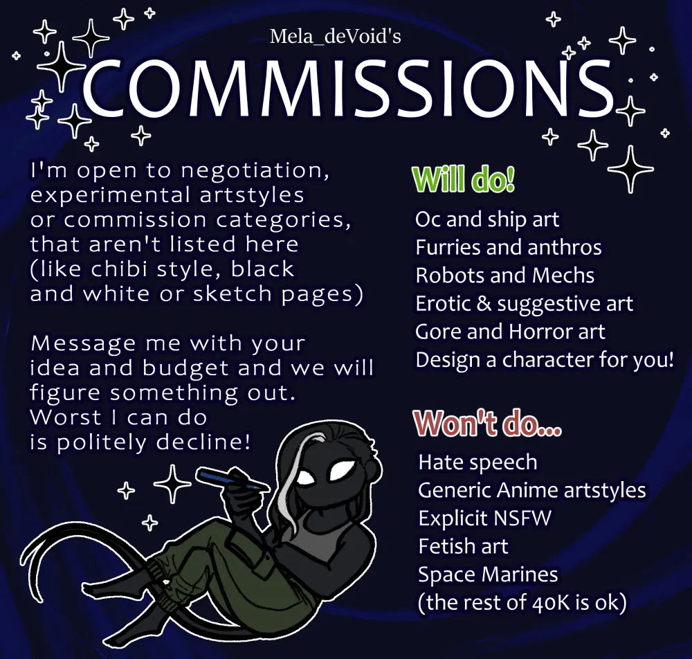Finally opening up Commissions on Bluesky ☺️ This has been very long overdue. If you'd like to get a piece from me or support me, feel free to send me a message. FAQ and terms of service in the link below. If you have any questions, don't hesitate to ask!