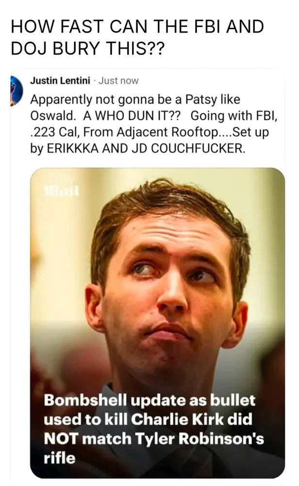 1. True "ATF cannot conclusively say Bullet came from Tyler Robinson's Gun" Yeah No Shit 2. True Psychopaths rarely commit suicide outside of the Orbit of Planet Hillary 3. False Who tried to assassinate Trump? The Same Guys that Shot CK and Killed JE #AbolishAIPAC#PlanetHillary#TheDemocrats