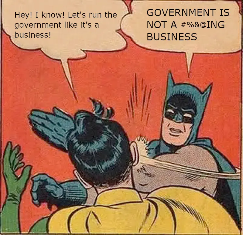 What happens to these public goods when you try to "run the government like a business"? Privatization. www.youtube.com/watch?v=hqn1uD_B70U