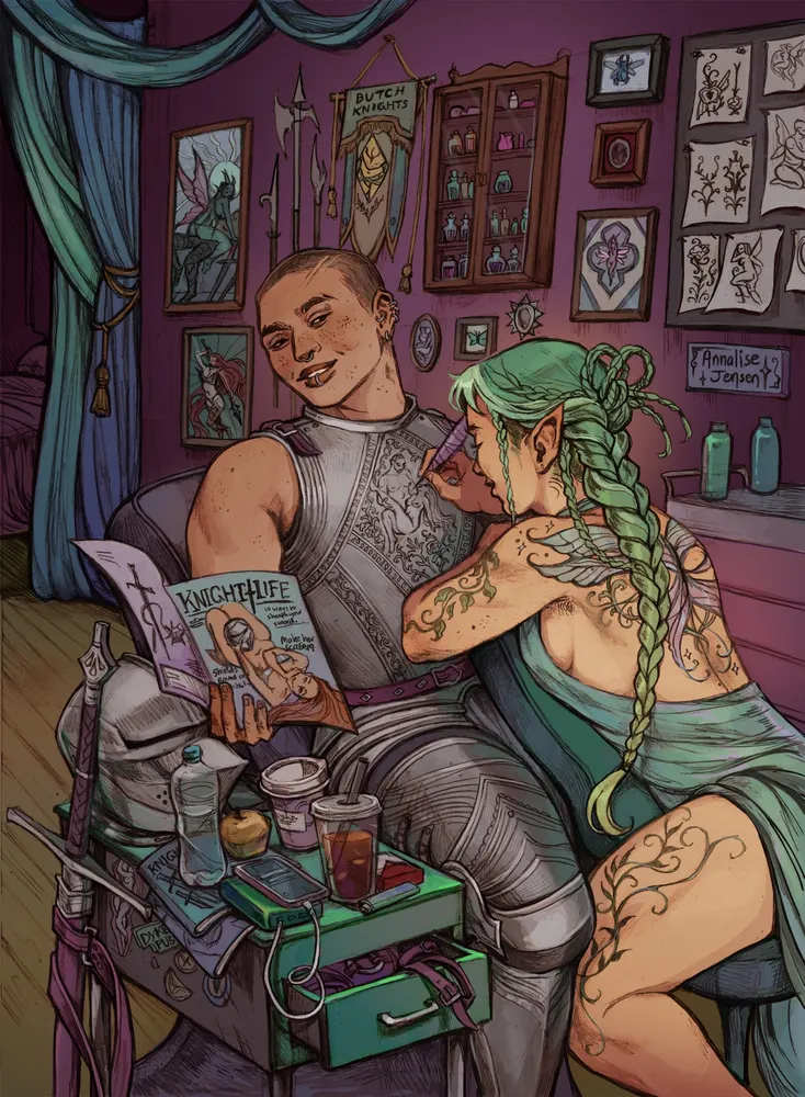 Got this idea in a dream of a hot lady engraving armour on a butch knight , akin to a tattoo artist. Now im itching to draw a sapphic paranormal comic 😮💨. I gotta stop