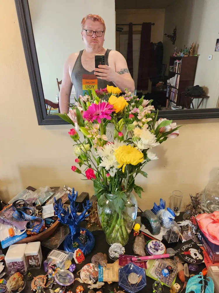 I had lunch with my parents today, and it didn't dissolve into the usual fight. As a reward and to keep the good vibes going, I bought some flowers to brighten up my space. Have a lovely day, you magnificent queer people!!!
