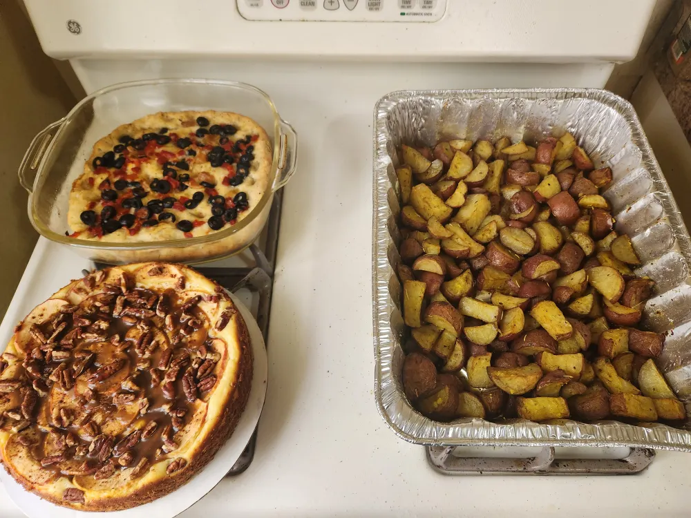 I have a game night this evening. I preparation, I made a salted caramel apple cheesecake, olive and pepper foccacia, and Fusaka spiced potatoes. I don't want my lawyer sent to the guillotine for my laziness.