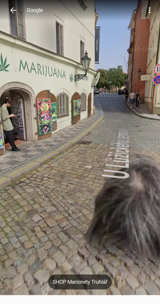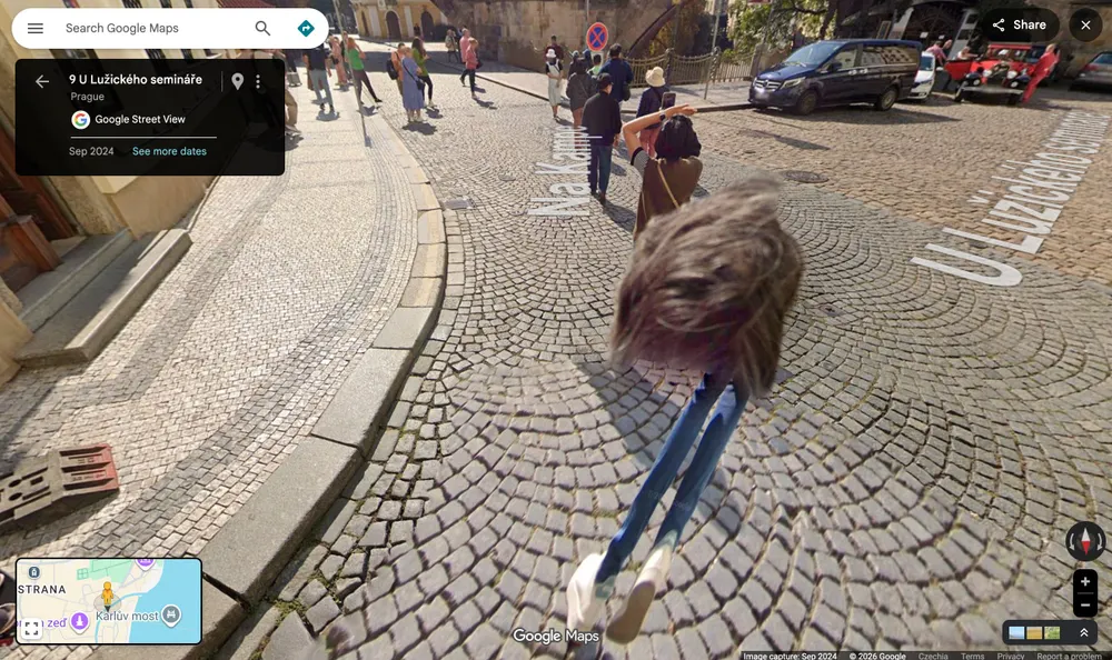I've been doing some research into locations in Prague using Google Maps, and either the guy who was tasked to take the photos got the camera position wrong, or there's a small hairy ghost haunting large swathes of the city.