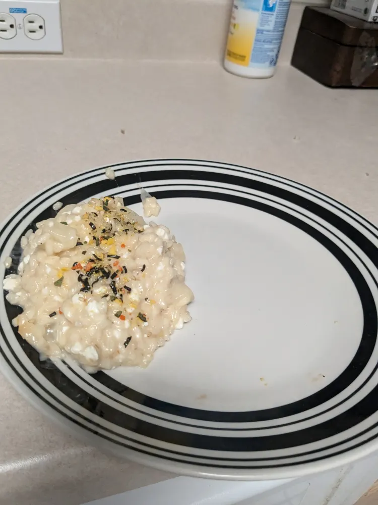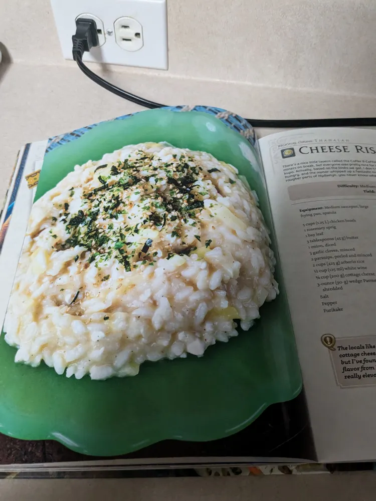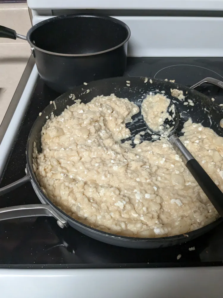 Made cheese risotto. Learned there is a significant difference between chopped and minced. Really tasty, kind of like a casserole. Great for some comfort food