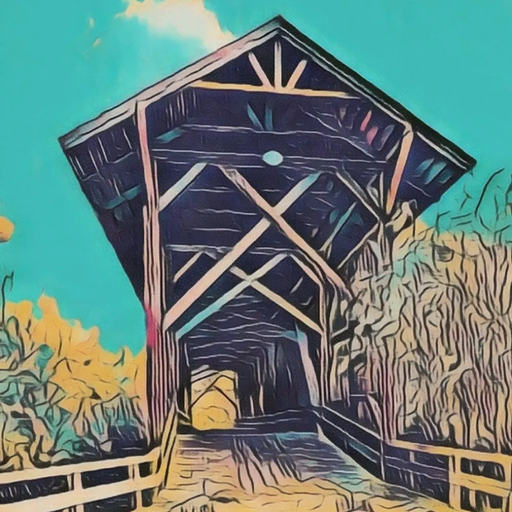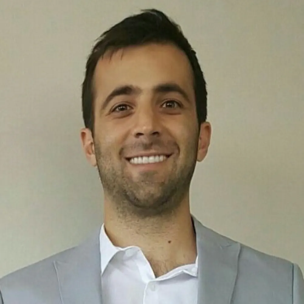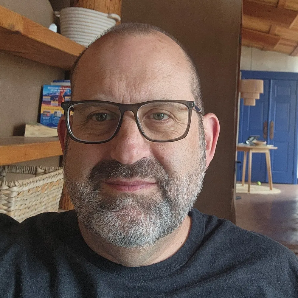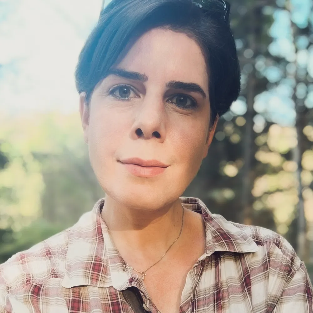 PFP: Andrea wearing an orange and blue plaid shirt and smiling