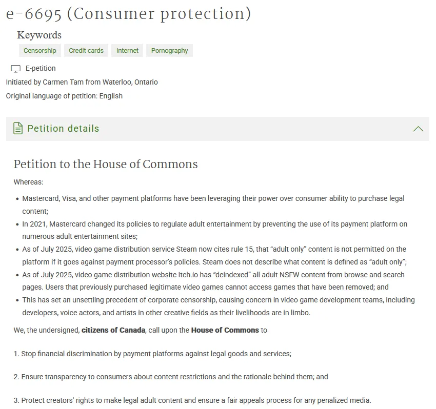 The official Canadian Petition to reign in payment processor censorship has stalled out just under 10k signatures.