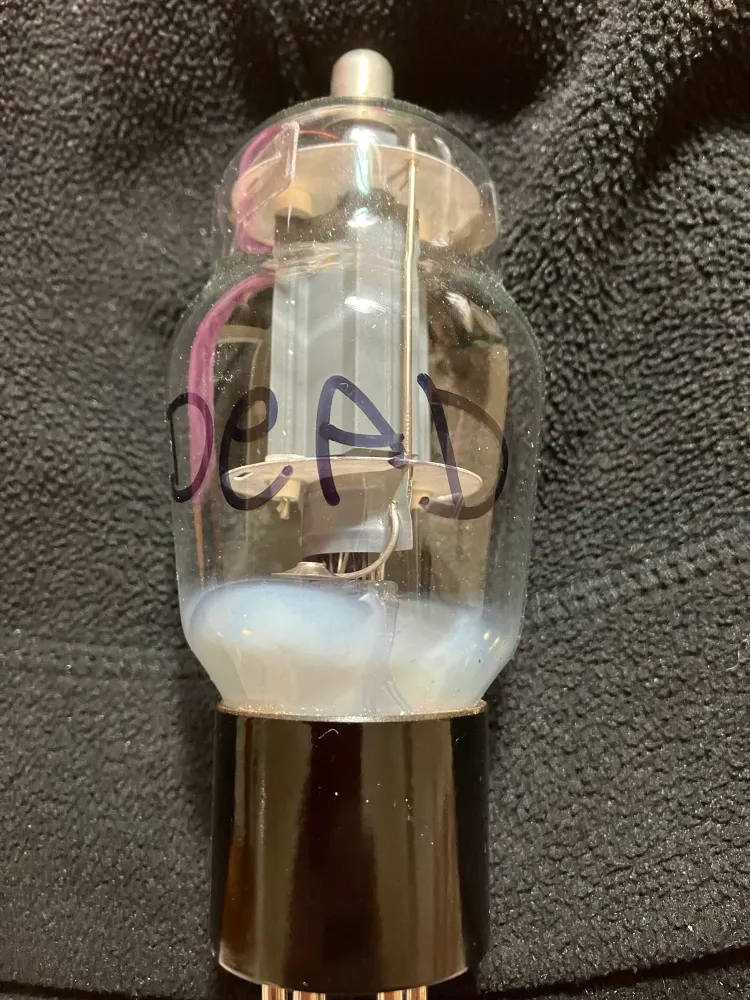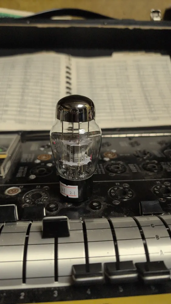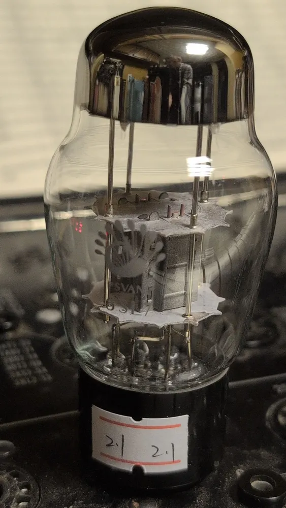 Another pair of Sylvania 6SN7’s, black plate chrome tops. These have red letters, other pair is green letter.