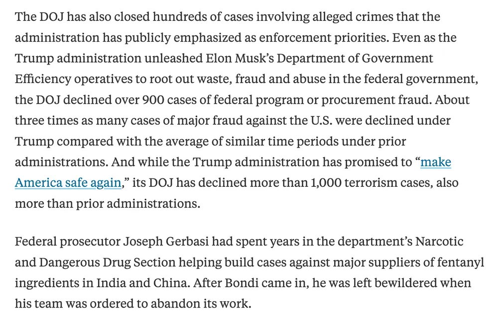 "Under Bondi, in the first six months of Trumpβs administration, DOJ quietly closed more than 23,000 criminal cases, abandoning hundreds of investigations into terrorism, white-collar crime, fraud, and drugs..."