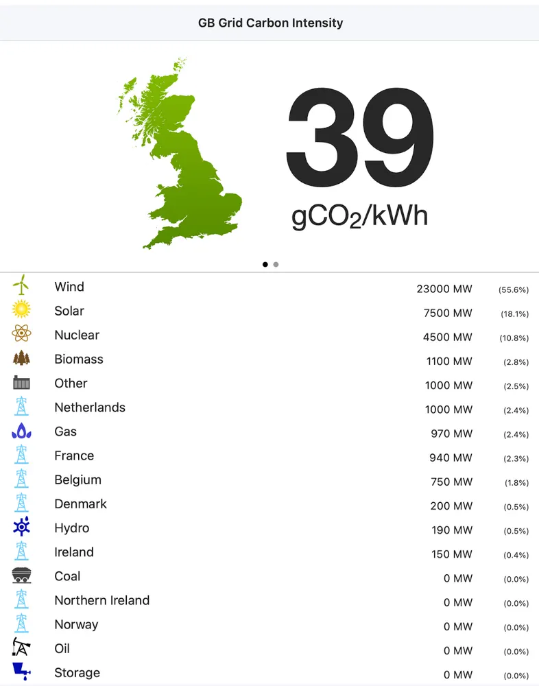 If you're in the UK and thinking "huh, it really is pretty windy today isn't it?", yeah, wind is currently supplying more than 23GW of power, that's 55% of the current UK grid, and solar is currently covering another 18.1%.