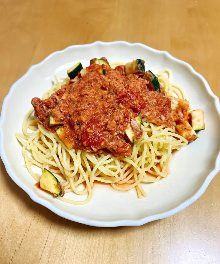 ツナとズッキーニのトマトスパゲッティ🍝うまうま〜!